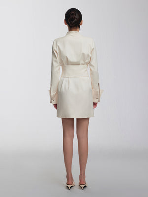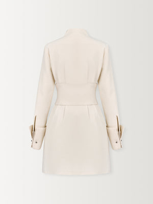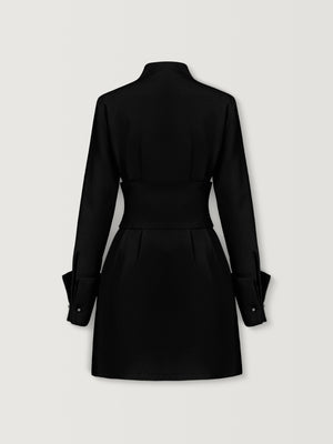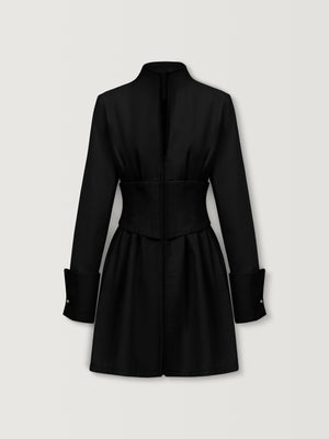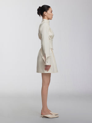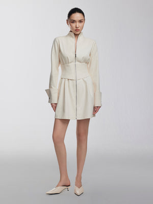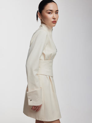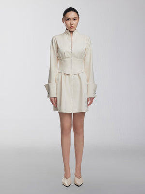 A structured shirt dress balancing form and fluidity, tailored with a fitted bodice and flared skirt framed by a corset-inspired waist, finished with a soft stand collar, oversized cuffs, and a front metal zip.