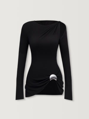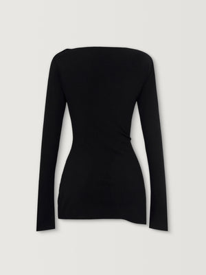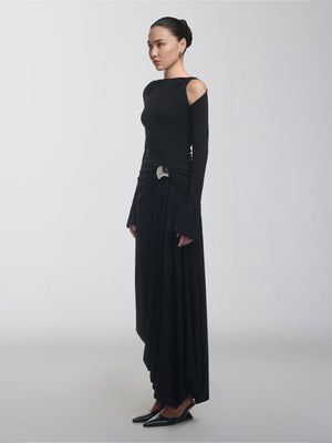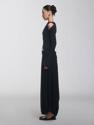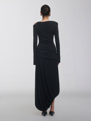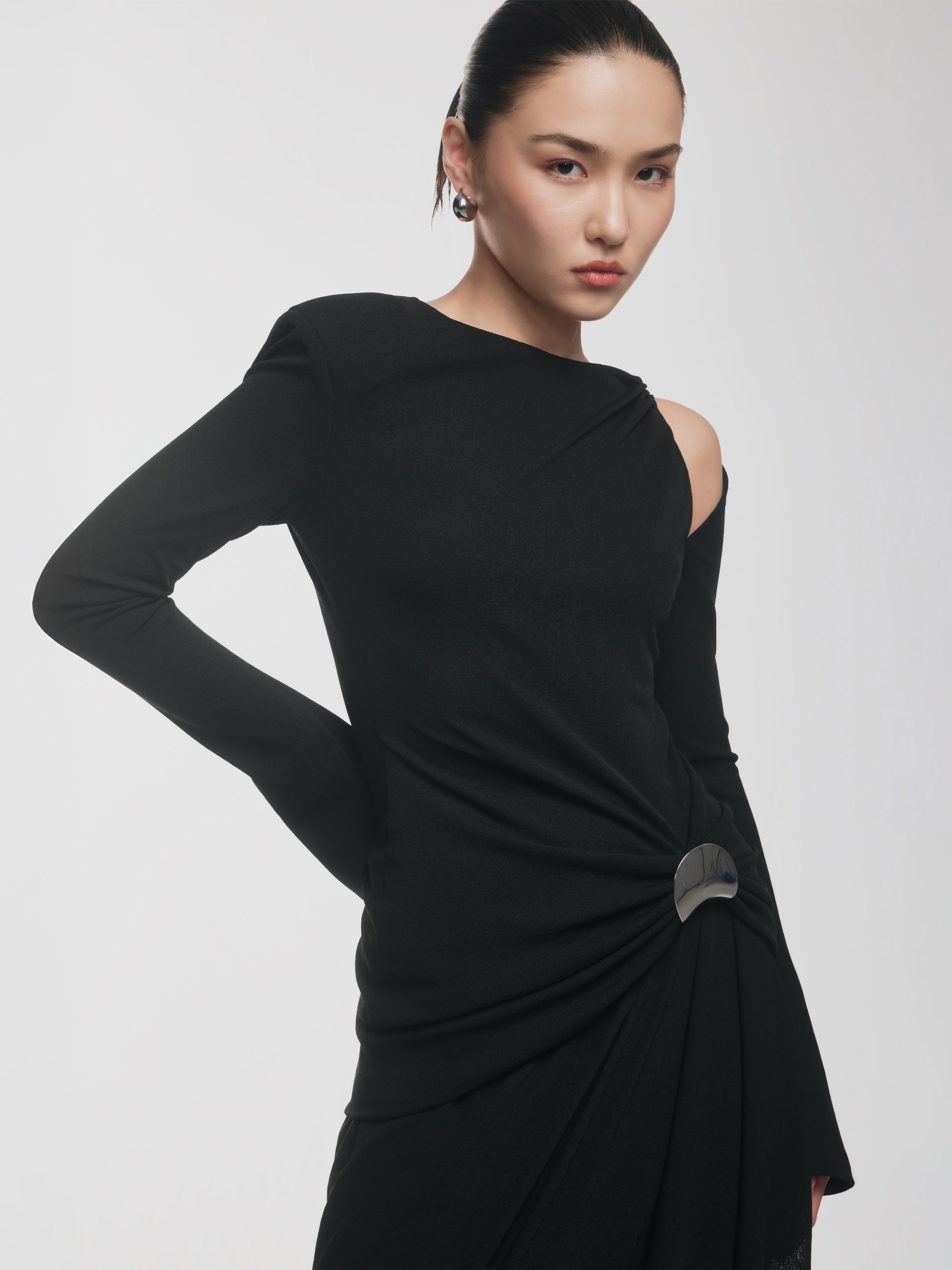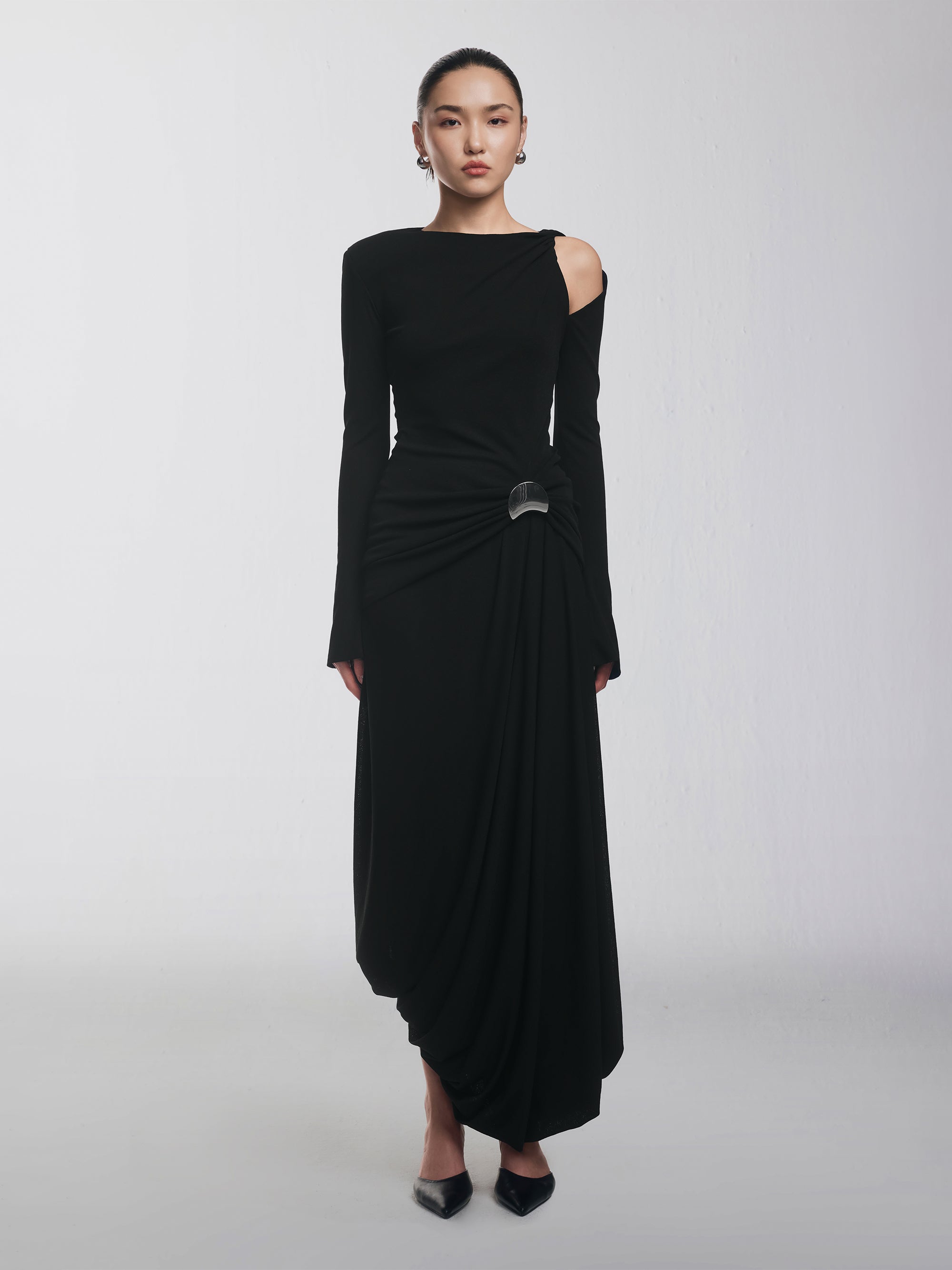 From shoulder to hip, a curved line settles into quiet drape, giving structure to softness and calm to motion.