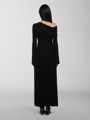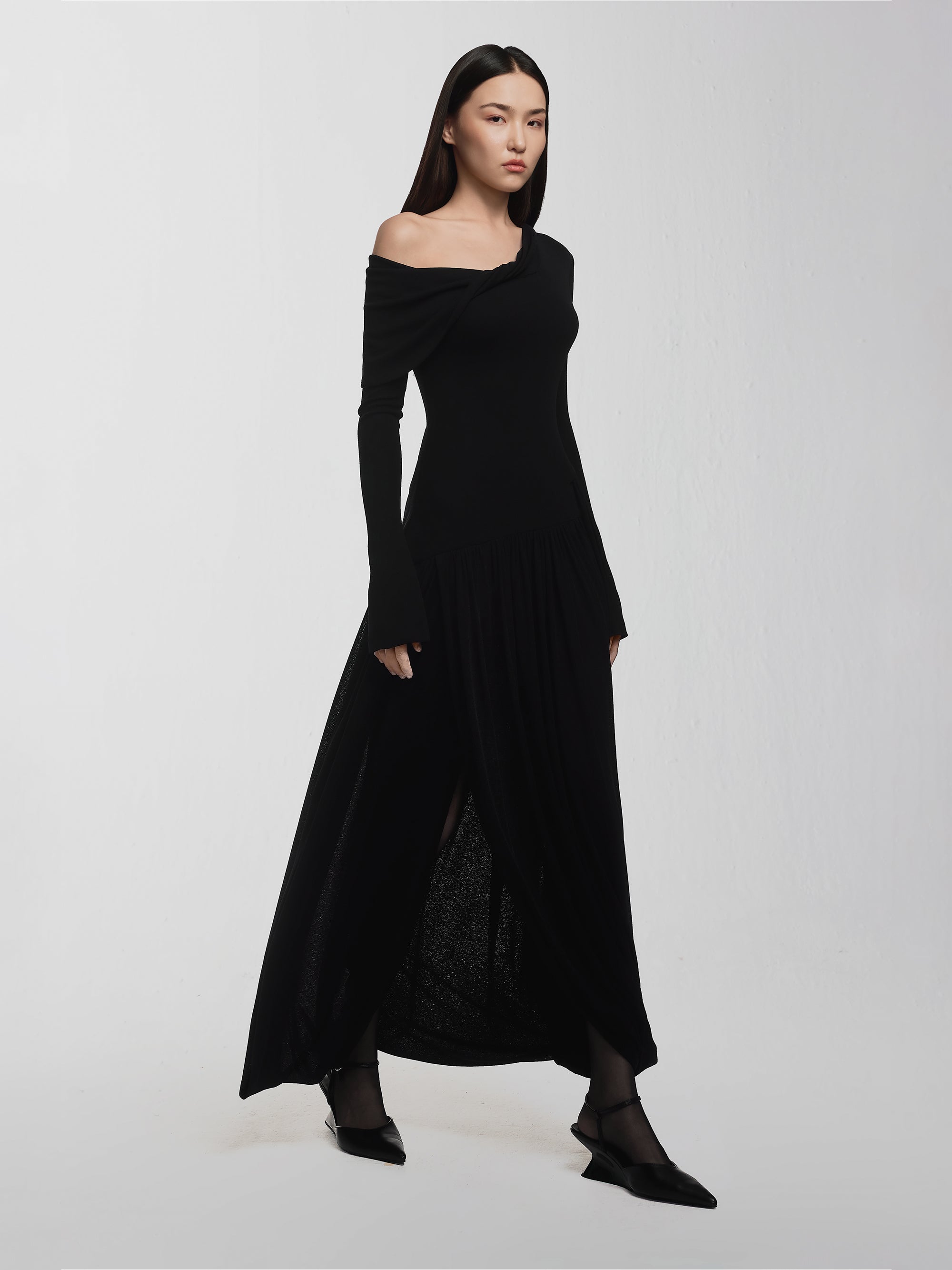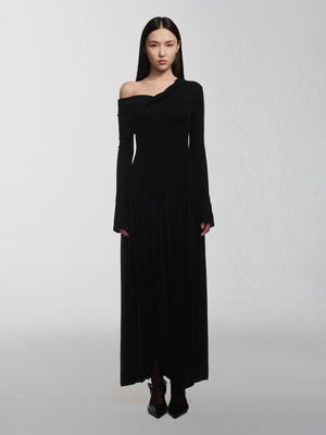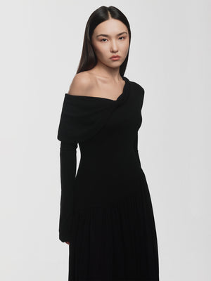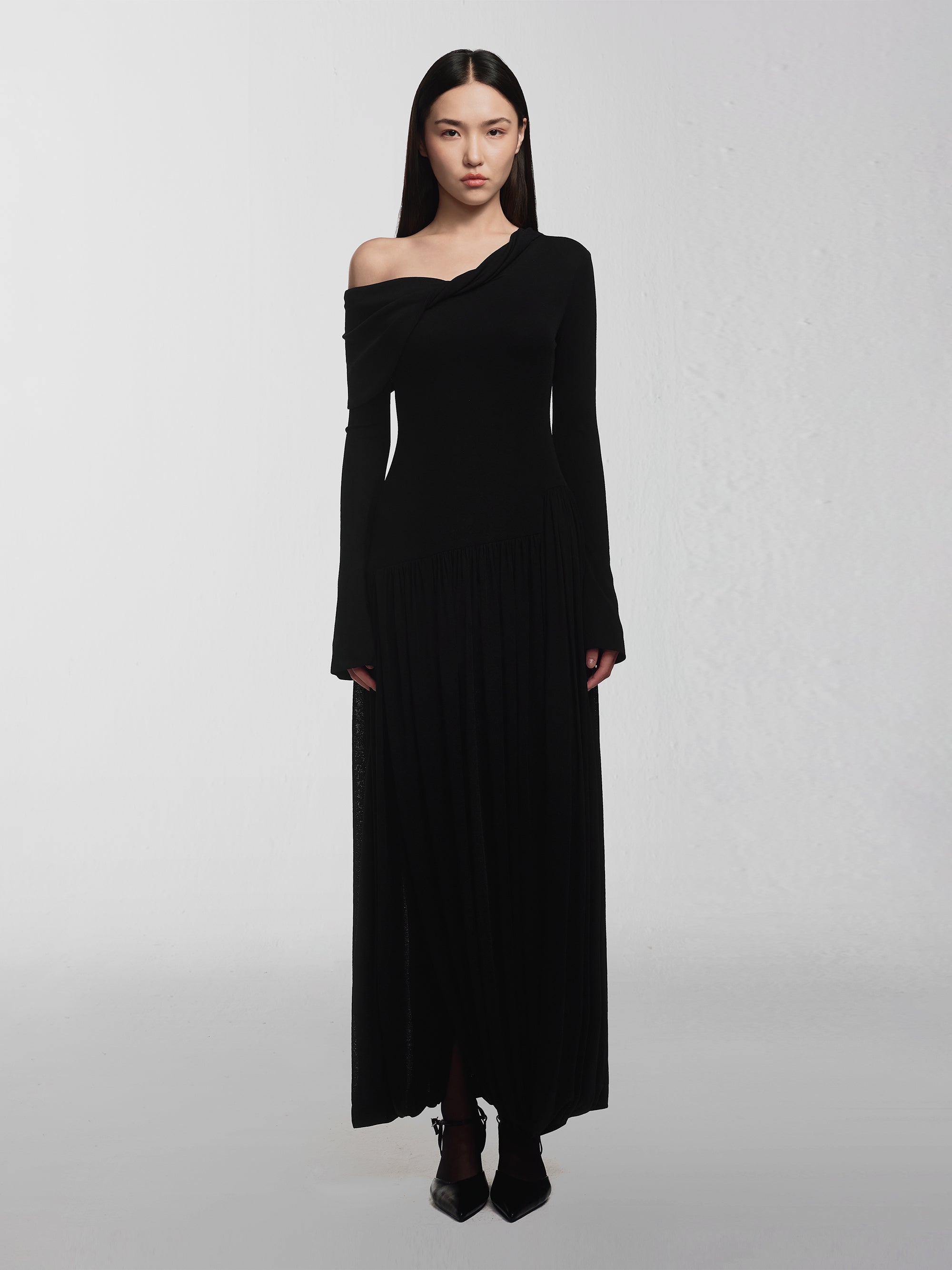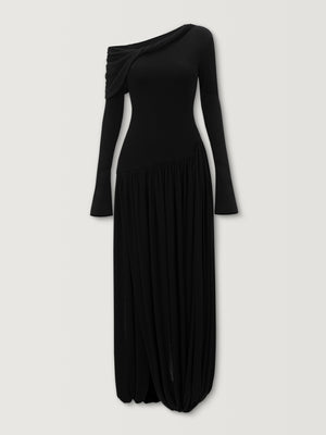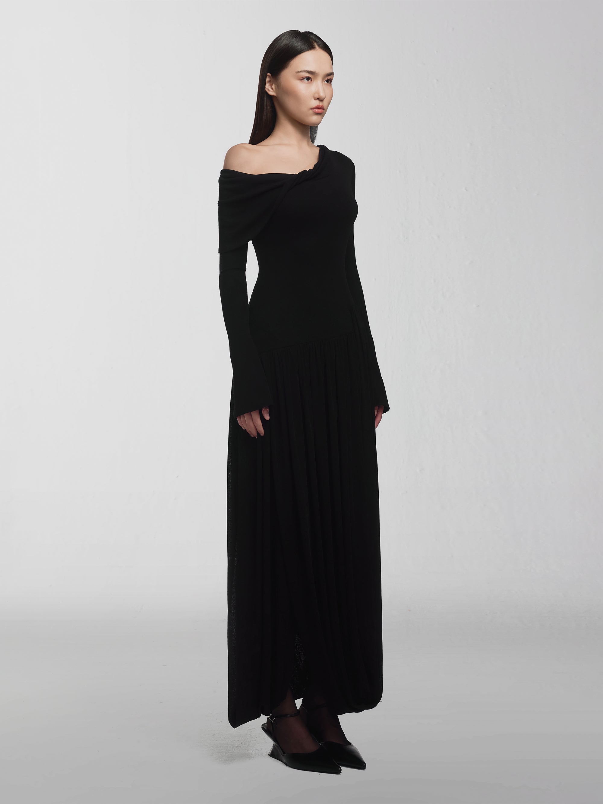 Twisted shoulder and soft draping define this asymmetric jersey dress — where form flows between structure and ease.