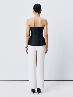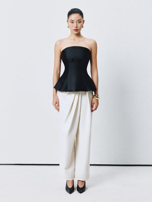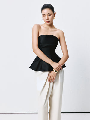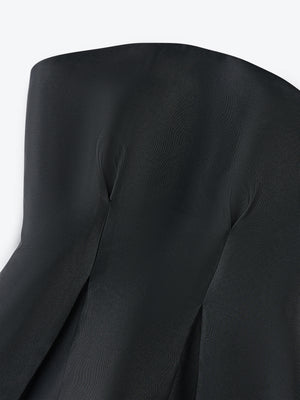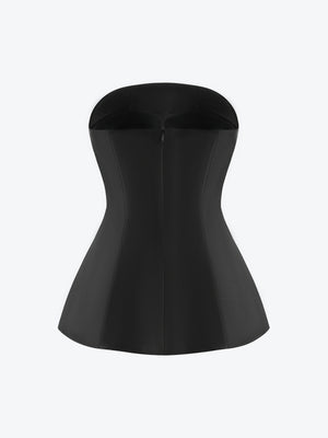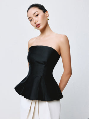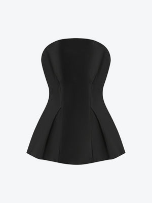 A sculpted strapless top with a structured bodice and flared hem, balancing architectural lines with soft movement.