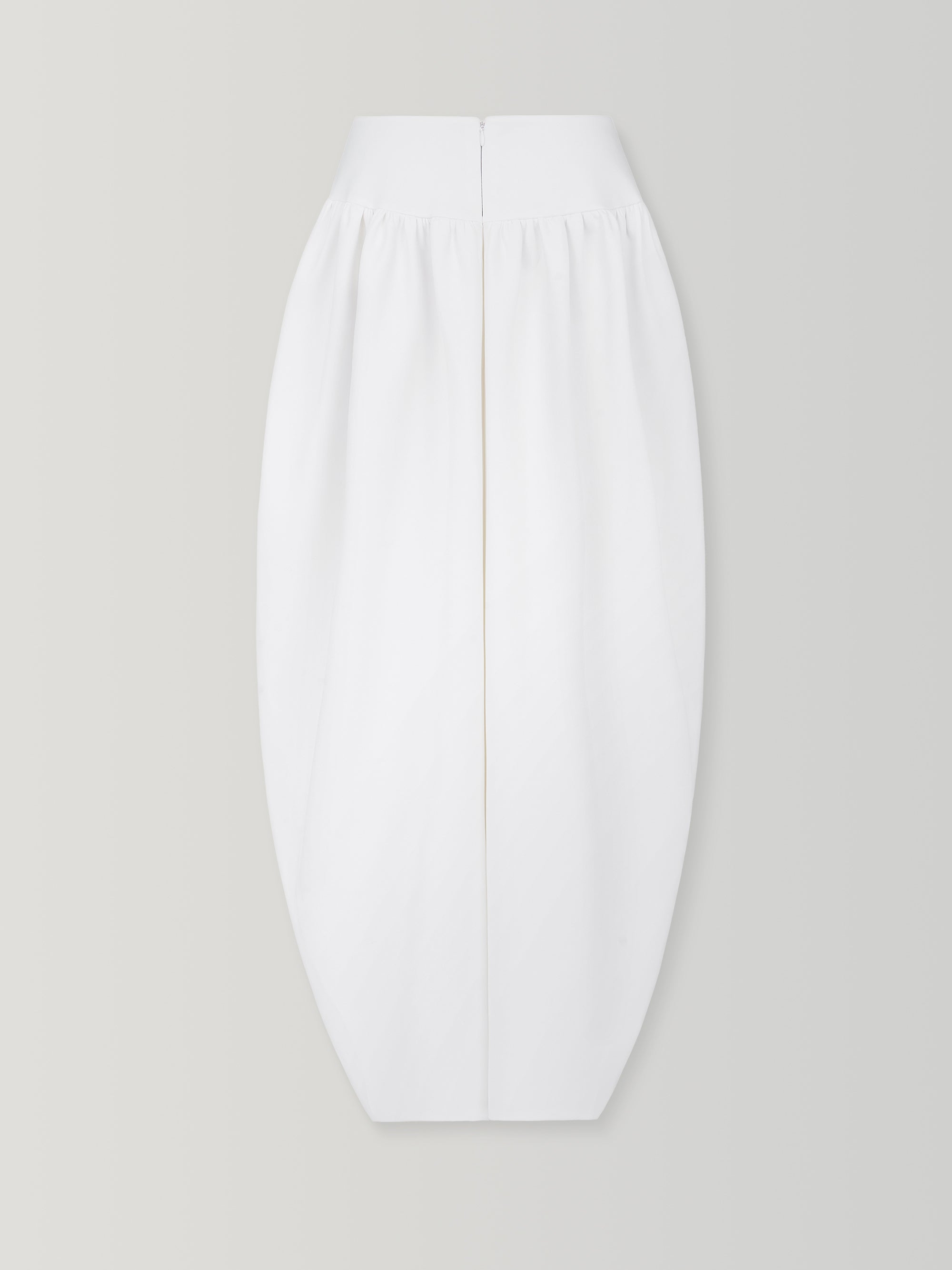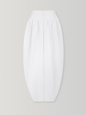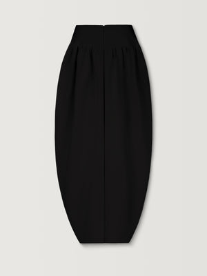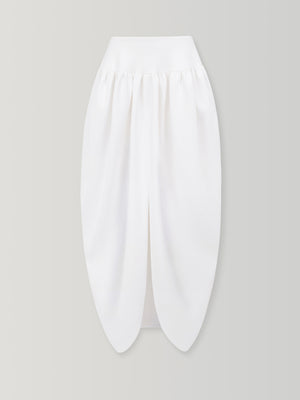 Softly constructed with a gathered drape, this skirt shapes volume through restraint, its front slit and rounded folds creating quiet movement against their weight.
