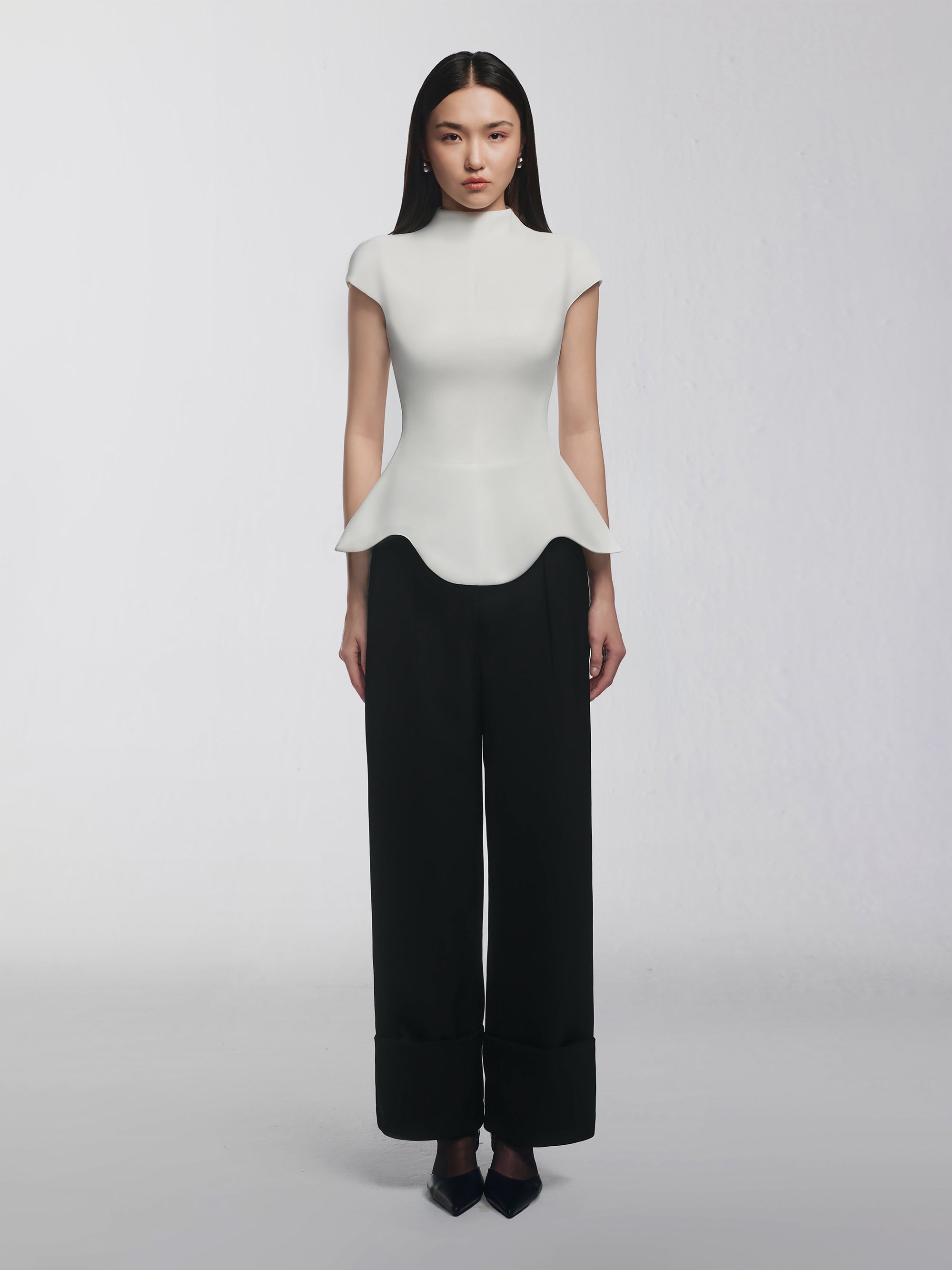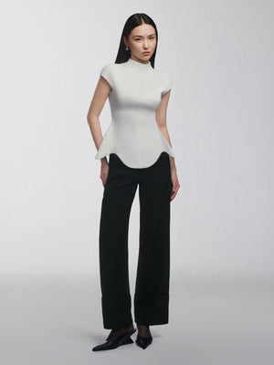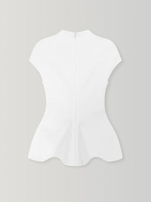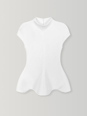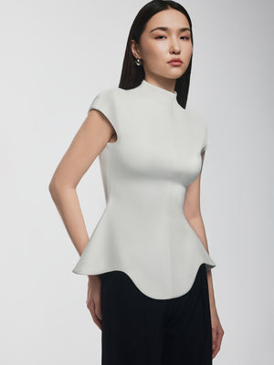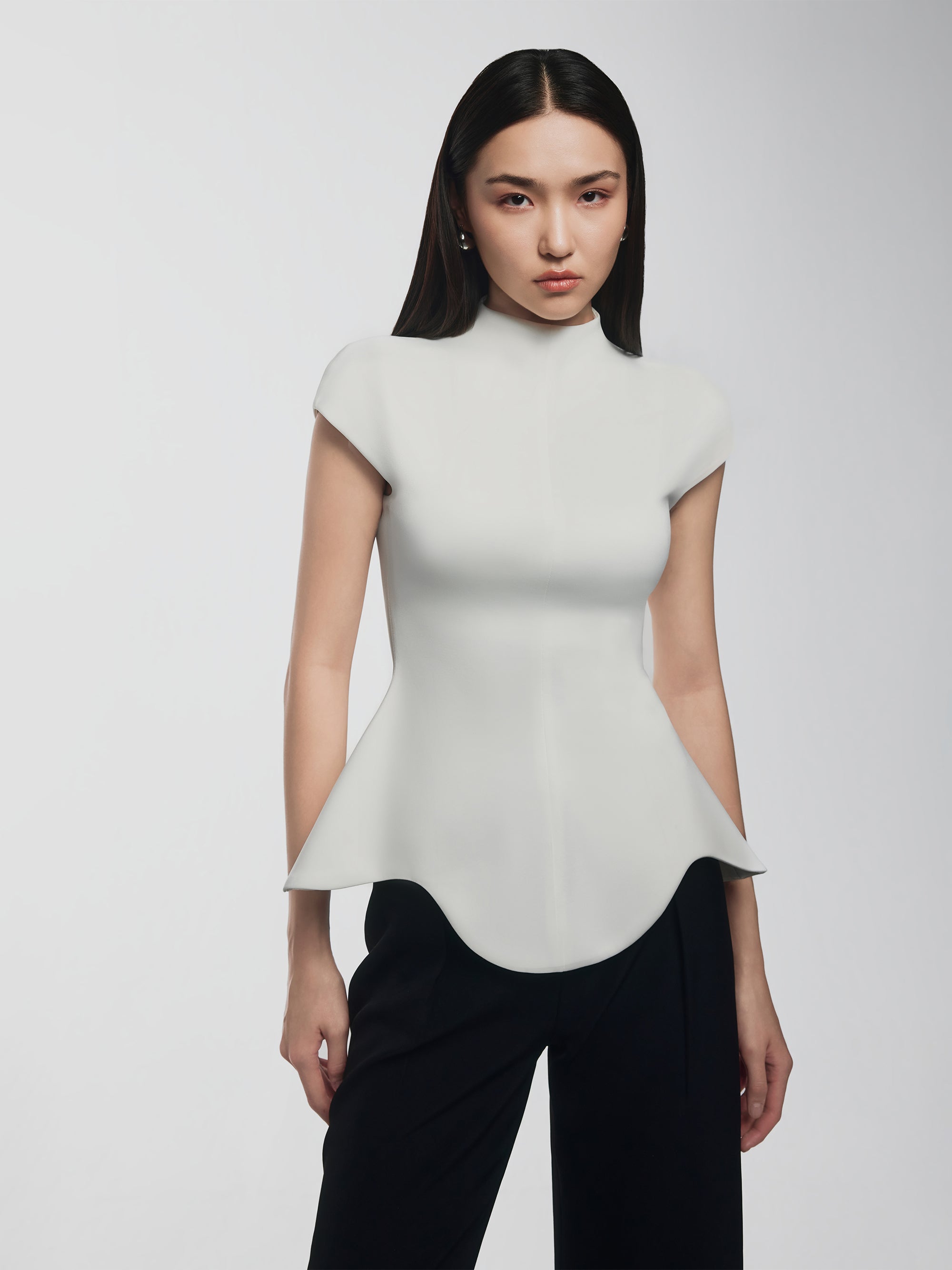 Sculpted with precision, this top defines the waist through a fluid yet architectural line, the contoured hem flowing softly outward to balance structure with grace.